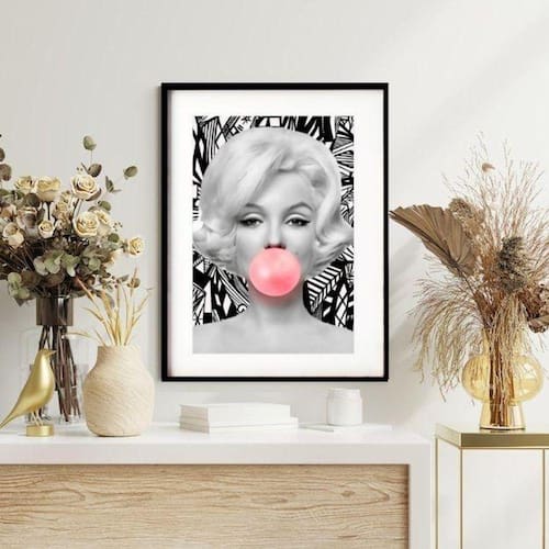 Quadro marilyn monroe bubble gum geométrico 60x48cm Moldura: madeira branca Informações do produto tire todas as suas dúvidas no descritivo abaixo: decoração para quarto, sala, cozinha, escritório, área gourmet e muito mais. Chega de paredes vazias medidas - cada peça tem 60x48cm . Material do papel - papel fotográfico brilhante de altíssima resolução acabamento - todos os quadros são acompanhados de vidro para proteção da imagem. - moldura em madeira maciça na cor preta ou branca conforme produto escolhido e pendurador. - paspatur branco com 7cm de largura - os quadros são embalados de forma segura com plástico bolha com camada dupla de acordo com o tamanho dos quadros. Garantia - garantia de 3 meses. Meu quadro chegou. Como posso fixá-lo Você precisa apenas de um martelo e um prego, pois os quadros já vão acompanhados de penduradores. Esta é a forma mais indicada. Como posso limpar meu quadro A limpeza é feita como um móvel comum da sua casa. Apenas um pano seco ou espanador são suficientes para tal