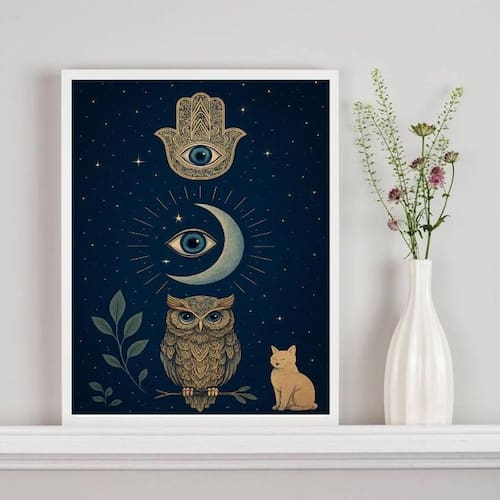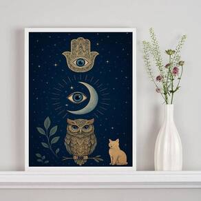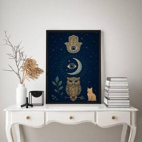 Quadro mistico hamsa lua coruja gato 24x18cm - com vidro Cor: moldura branca Informações do produto tire todas as suas dúvidas no descritivo abaixo: decoração para quarto, sala, cozinha, escritório, área gourmet e muito mais. Chega de paredes vazias medidas - cada peça tem 24x18cm a5 . Material do papel - papel fotográfico brilhante de altíssima resolução acabamento - todos os quadros são acompanhados de vidro para proteção da imagem. - moldura em madeira maciça na cor preta ou branca conforme produto escolhido e pendurador . - os quadros são embalados de forma segura com plástico bolha com camada dupla de acordo com o tamanho dos quadros. - de 3 meses. Meu quadro chegou. Como posso fixá-lo Você precisa apenas de um martelo e um prego, pois os quadros já vão acompanhados de penduradores. Esta é a forma mais indicada. Como posso limpar meu quadro A limpeza é feita como um móvel comum da sua casa. Apenas um pano seco ou espanador são suficientes para tal Marca: Não Informado Ean: 7901039743735