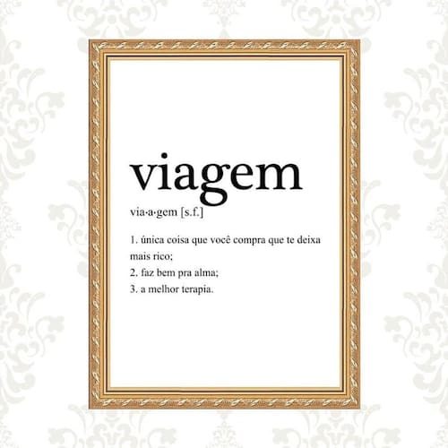 Quadro moldura dourada viagem significado 33x24cm Acabamento: com acetato Informações do produto tire todas as suas dúvidas no descritivo abaixo: decoração para quarto, sala, cozinha, escritório, área gourmet e muito mais. Chega de paredes vazias medidas - cada peça tem 33x24cm a4 . Material do papel - papel fotográfico brilhante de altíssima resolução acabamento - todos os quadros são acompanhados de vidro ou uma película de acetato para proteção da imagem conforme escolha . - os quadros são embalados de forma segura com plástico bolha com camada dupla de acordo com o tamanho dos quadros. Garantia - garantia de 3 meses. Meu quadro chegou. Como posso fixá-lo Você precisa apenas de um martelo e um prego, pois os quadros já vão acompanhados de penduradores. Esta é a forma mais indicada. Caso prefira, você pode utilizar uma fita dupla face neste caso, sugerimos de alta qualidade para evitar que descole e seu quadro caia . Como posso limpar meu quadro A limpeza é feita como um móvel comum da sua casa. Apenas um pano seco ou espanador são suficientes para tal