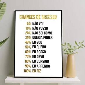 Quadro motivacional chances de sucesso 33x24cm Moldura: madeira branca Informações do produto tire todas as suas dúvidas no descritivo abaixo: decoração para quarto, sala, cozinha, escritório, área gourmet e muito mais. Chega de paredes vazias medidas - cada peça tem 33x24cm a4 . Material do papel - papel fotográfico brilhante de altíssima resolução acabamento - todos os quadros são acompanhados de uma película de acetato para proteção da imagem. - os quadros são embalados de forma segura com plástico bolha com camada dupla de acordo com o tamanho dos quadros. Garantia - garantia de 3 meses. Meu quadro chegou. Como posso fixá-lo Você precisa apenas de um martelo e um prego, pois os quadros já vão acompanhados de penduradores. Esta é a forma mais indicada. Caso prefira, você pode utilizar uma fita dupla face neste caso, sugerimos de alta qualidade para evitar que descole e seu quadro caia . Como posso limpar meu quadro A limpeza é feita como um móvel comum da sua casa. Apenas um pano seco ou espanador são suficientes para tal Ean: 7899709783429