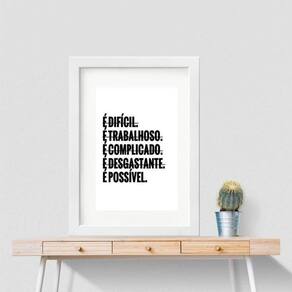 Quadro motivacional é possível - 60x48cm - com vidro Moldura: madeira branca Informações do produto tire todas as suas dúvidas no descritivo abaixo: decoração para quarto, sala, cozinha, escritório, área gourmet e muito mais. Chega de paredes vazias medidas - kit composto por 6 quadros, sendo 2 quadros com medida 18x24cm, 3 quadros com 24x33cm e 1 quadro com medida 33x45cm. Material do papel - papel fotográfico brilhante de altíssima resolução acabamento - todos os quadros são acompanhados de vidro para proteção da imagem. - moldura em madeira maciça na cor preta ou branca conforme produto escolhido e pendurador . - os quadros são embalados de forma segura com plástico bolha com camada dupla de acordo com o tamanho dos quadros. Garantia - garantia de 3 meses. Meu quadro chegou. Como posso fixá-lo Você precisa apenas de um martelo e um prego, pois os quadros já vão acompanhados de penduradores. Esta é a forma mais indicada. Como posso limpar meu quadro A limpeza é feita como um móvel comum da sua casa. Apenas um pano seco ou espanador são suficientes para tal