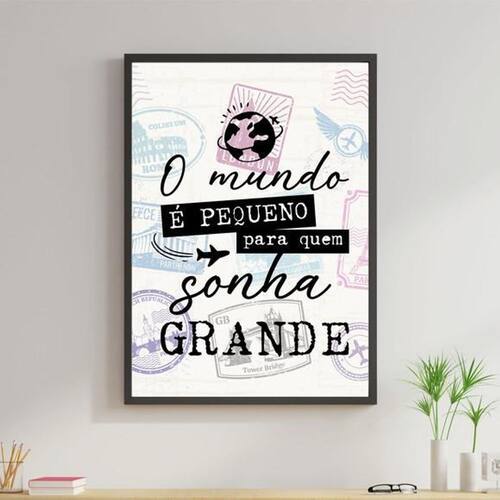 Quadro mundo pequeno sonho grande 33x24cm - com vidro Moldura: madeira preta Informações do produto tire todas as suas dúvidas no descritivo abaixo: decoração para quarto, sala, cozinha, escritório, área gourmet e muito mais. Chega de paredes vazias medidas - cada peça tem 33x24cm a4 . Material do papel - papel fotográfico brilhante de altíssima resolução acabamento - todos os quadros são acompanhados de vidro para proteção da imagem. - moldura em madeira maciça na cor preta e pendurador . - os quadros são embalados de forma segura com plástico bolha com camada dupla de acordo com o tamanho dos quadros. Garantia - garantia de 3 meses. Meu quadro chegou. Como posso fixá-lo Você precisa apenas de um martelo e um prego, pois os quadros já vão acompanhados de penduradores. Esta é a forma mais indicada. Como posso limpar meu quadro A limpeza é feita como um móvel comum da sua casa. Apenas um pano seco ou espanador são suficientes para tal