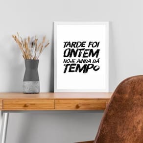 Quadro não é tarde ainda dá tempo 45x34cm - com vidro Cor: moldura branca Informações do produto tire todas as suas dúvidas no descritivo abaixo: decoração para quarto, sala, cozinha, escritório, área gourmet e muito mais. Chega de paredes vazias medidas - cada peça tem 45x34cm a3 . Material do papel - papel fotográfico brilhante de altíssima resolução acabamento - todos os quadros são acompanhados de vidro para proteção da imagem. - moldura em madeira maciça na cor preta ou branca conforme produto escolhido e pendurador . - os quadros são embalados de forma segura com plástico bolha com camada dupla de acordo com o tamanho dos quadros. Garantia - garantia de 3 meses. Meu quadro chegou. Como posso fixá-lo Você precisa apenas de um martelo e um prego, pois os quadros já vão acompanhados de penduradores. Esta é a forma mais indicada. Como posso limpar meu quadro A limpeza é feita como um móvel comum da sua casa. Apenas um pano seco ou espanador são suficientes para tal