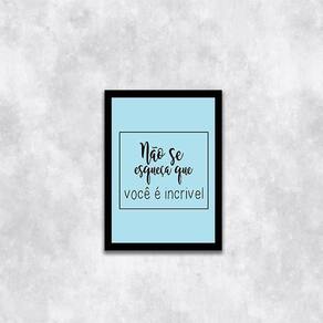 Quadro não se esqueça que você é incrível 24x18cm Moldura: madeira preta Informações do produto tire todas as suas dúvidas no descritivo abaixo: decoração para quarto, sala, cozinha, escritório, área gourmet e muito mais. Chega de paredes vazias medidas - cada peça tem 24x18cm a5 . Material do papel - papel fotográfico brilhante de altíssima resolução acabamento - todos os quadros são acompanhados de uma película de acetato para proteção da imagem. - moldura em madeira maciça na cor branca e pendurador móvel que pode ser retirado facilmente caso deseje fixar com fita dupla face. - os quadros são embalados de forma segura com plástico bolha com camada dupla de acordo com o tamanho dos quadros. Garantia - garantia de 3 meses prazo de envio pedimos 24 horas úteis no máximo para enviar seu pedido após o envio, segue os prazos normais dos correios, cerca de 7 dias úteis exceto para norte e nordeste, que pode ser de até 14 dias úteis. Em diversas cidades, este prazo normalmente é reduzido, mas depende do prazo dos correios. Meu quadro chegou. Como posso fixá-lo Você precisa apenas de um martelo e um prego, pois os quadros já vão acompanhados de penduradores. Esta é a forma mais indicada. Caso prefira, você pode utilizar uma fita dupla face neste caso, sugerimos de alta qualidade para evitar que descole e seu quadro caia . Como posso limpar meu quadro A limpeza é feita como um móvel comum da sua casa. Apenas um pano seco ou espanador são suficientes para tal Ean: 7892091052586