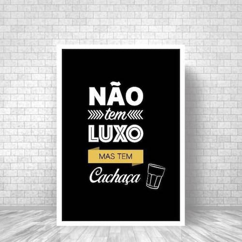 Quadro não tem luxo mas tem cachaça 24x18cm Moldura: madeira branca Informações do produto tire todas as suas dúvidas no descritivo abaixo: decoração para quarto, sala, cozinha, escritório, área gourmet e muito mais. Chega de paredes vazias medidas - cada peça tem 24x18cm a5 . Material do papel - papel fotográfico brilhante de altíssima resolução acabamento - todos os quadros são acompanhados de uma película de acetato para proteção da imagem. - moldura em madeira maciça na cor branca e pendurador móvel que pode ser retirado facilmente caso deseje fixar com fita dupla face. - os quadros são embalados de forma segura com plástico bolha com camada dupla de acordo com o tamanho dos quadros. - de 3 meses prazo de envio pedimos 24 horas úteis no máximo para enviar seu pedido após o envio, segue os prazos normais dos correios, cerca de 7 exceto para norte e nordeste, que pode ser de até 14 . Em diversas cidades, este prazo normalmente é reduzido, mas depende do prazo dos correios. Meu quadro chegou. Como posso fixá-lo Você precisa apenas de um martelo e um prego, pois os quadros já vão acompanhados de penduradores. Esta é a forma mais indicada. Caso prefira, você pode utilizar uma fita dupla face neste caso, sugerimos de alta qualidade para evitar que descole e seu quadro caia . Como posso limpar meu quadro A limpeza é feita como um móvel comum da sua casa. Apenas um pano seco ou espanador são suficientes para tal Marca: Não Informado