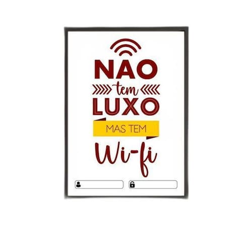 Quadro não tem luxo mas tem wi-fi - branco 33x24cm - com vidro Moldura: madeira branca Informações do produto tire todas as suas dúvidas no descritivo abaixo: decoração para quarto, sala, cozinha, escritório, área gourmet e muito mais. Chega de paredes vazias medidas - cada peça tem 33x24cm a4 . Material do papel - papel fotográfico brilhante de altíssima resolução acabamento - todos os quadros são acompanhados de vidro para proteção da imagem. - moldura em madeira maciça na cor preta e pendurador . - os quadros são embalados de forma segura com plástico bolha com camada dupla de acordo com o tamanho dos quadros. - de 3 meses. Meu quadro chegou. Como posso fixá-lo Você precisa apenas de um martelo e um prego, pois os quadros já vão acompanhados de penduradores. Esta é a forma mais indicada. Como posso limpar meu quadro A limpeza é feita como um móvel comum da sua casa. Apenas um pano seco ou espanador são suficientes para tal Marca: Não Informado
