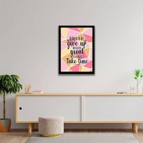 Quadro Never Give Up Because Great Things Take Time 24X18Cm Moldura: madeira branca Informações do produto Decoração para quarto, sala, cozinha, escritório, área gourmet e muito mais. Chega de paredes vazias. Medidas - cada peça tem 24x18cm a5 . Material do papel - papel fotográfico brilhante de altíssima resolução Acabamento - todos os quadros são acompanhados de uma película de acetato para proteção da imagem. - moldura em madeira maciça na cor branca e pendurador móvel que pode ser retirado facilmente caso deseje fixar com fita dupla face. - os quadros são embalados de forma segura com plástico bolha com camada dupla de acordo com o tamanho dos quadros. - de 3 meses Meu quadro chegou. Como posso fixá-lo: Você precisa apenas de um martelo e um prego, pois os quadros já vão acompanhados de penduradores. Esta é a forma mais indicada. Caso prefira, você pode utilizar uma fita dupla face neste caso, sugerimos de alta qualidade para evitar que descole e seu quadro caia . Como posso limpar meu quadro: A limpeza é feita como um móvel comum da sua casa. Apenas um pano seco ou espanador são suficientes para tal Marca: Não Informado Ean: 7892091052739