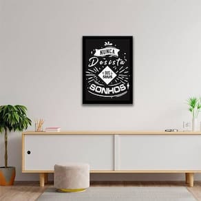 Quadro nunca desista dos seus sonhos 33x24cm - com vidro Moldura: madeira preta Informações do produto tire todas as suas dúvidas no descritivo abaixo: decoração para quarto, sala, cozinha, escritório, área gourmet e muito mais. Chega de paredes vazias medidas - cada peça tem 33x24cm a4 . Material do papel - papel fotográfico brilhante de altíssima resolução acabamento - todos os quadros são acompanhados de vidro para proteção da imagem. - moldura em madeira maciça na cor preta e pendurador . - os quadros são embalados de forma segura com plástico bolha com camada dupla de acordo com o tamanho dos quadros. - de 3 meses. Meu quadro chegou. Como posso fixá-lo Você precisa apenas de um martelo e um prego, pois os quadros já vão acompanhados de penduradores. Esta é a forma mais indicada. Como posso limpar meu quadro A limpeza é feita como um móvel comum da sua casa. Apenas um pano seco ou espanador são suficientes para tal Marca: Não Informado