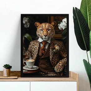 Quadro onça elegante tomando café 33x24cm - com vidro Cor: moldura branca Informações do produto tire todas as suas dúvidas no descritivo abaixo: decoração para quarto, sala, cozinha, escritório, área gourmet e muito mais. Chega de paredes vazias medidas - cada peça tem 33x24cm a4 . Material do papel - papel fotográfico brilhante de altíssima resolução acabamento - todos os quadros são acompanhados de vidro para proteção da imagem. - moldura em madeira maciça na cor preta ou branca conforme produto escolhido e pendurador . - os quadros são embalados de forma segura com plástico bolha com camada dupla de acordo com o tamanho dos quadros. - de 3 meses. Meu quadro chegou. Como posso fixá-lo Você precisa apenas de um martelo e um prego, pois os quadros já vão acompanhados de penduradores. Esta é a forma mais indicada. Como posso limpar meu quadro A limpeza é feita como um móvel comum da sua casa. Apenas um pano seco ou espanador são suficientes para tal