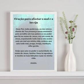 Quadro oração contra a inveja 24x18cm Moldura: madeira preta Informações do produto tire todas as suas dúvidas no descritivo abaixo: decoração para quarto, sala, cozinha, escritório, área gourmet e muito mais. Chega de paredes vazias medidas - cada peça tem 24x18cm a5 . Material do papel - papel fotográfico brilhante de altíssima resolução acabamento - todos os quadros são acompanhados de uma película de acetato para proteção da imagem. - os quadros são embalados de forma segura com plástico bolha com camada dupla de acordo com o tamanho dos quadros. Garantia - garantia de 3 meses. Meu quadro chegou. Como posso fixá-lo Você precisa apenas de um martelo e um prego, pois os quadros já vão acompanhados de penduradores. Esta é a forma mais indicada. Caso prefira, você pode utilizar uma fita dupla face neste caso, sugerimos de alta qualidade para evitar que descole e seu quadro caia . Como posso limpar meu quadro A limpeza é feita como um móvel comum da sua casa. Apenas um pano seco ou espanador são suficientes para tal Ean: 7898094599684