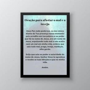 Quadro oração contra a inveja 24x18cm Moldura: madeira branca Informações do produto tire todas as suas dúvidas no descritivo abaixo: decoração para quarto, sala, cozinha, escritório, área gourmet e muito mais. Chega de paredes vazias medidas - cada peça tem 24x18cm a5 . Material do papel - papel fotográfico brilhante de altíssima resolução acabamento - todos os quadros são acompanhados de uma película de acetato para proteção da imagem. - os quadros são embalados de forma segura com plástico bolha com camada dupla de acordo com o tamanho dos quadros. Garantia - garantia de 3 meses. Meu quadro chegou. Como posso fixá-lo Você precisa apenas de um martelo e um prego, pois os quadros já vão acompanhados de penduradores. Esta é a forma mais indicada. Caso prefira, você pode utilizar uma fita dupla face neste caso, sugerimos de alta qualidade para evitar que descole e seu quadro caia . Como posso limpar meu quadro A limpeza é feita como um móvel comum da sua casa. Apenas um pano seco ou espanador são suficientes para tal