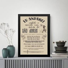Quadro oração de são jorge - bege 33x24cm Cor: moldura branca Informações do produto tire todas as suas dúvidas no descritivo abaixo: decoração para quarto, sala, cozinha, escritório, área gourmet e muito mais. Chega de paredes vazias medidas - cada peça tem 33x24cm a4 . Material do papel - papel fotográfico brilhante de altíssima resolução acabamento - todos os quadros são acompanhados de uma película de acetato para proteção da imagem. - os quadros são embalados de forma segura com plástico bolha com camada dupla de acordo com o tamanho dos quadros. - de 3 meses. Meu quadro chegou. Como posso fixá-lo Você precisa apenas de um martelo e um prego, pois os quadros já vão acompanhados de penduradores. Esta é a forma mais indicada. Caso prefira, você pode utilizar uma fita dupla face neste caso, sugerimos de alta qualidade para evitar que descole e seu quadro caia . Como posso limpar meu quadro A limpeza é feita como um móvel comum da sua casa. Apenas um pano seco ou espanador são suficientes para tal Ean: 7892158427388