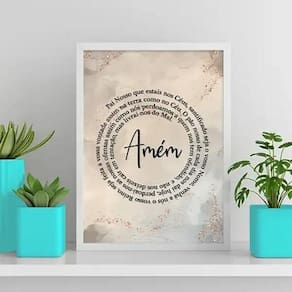 Quadro oração pai nosso - mármore bege e dourado 45x34cm - com vidro Moldura: madeira branca Informações do produto tire todas as suas dúvidas no descritivo abaixo: decoração para quarto, sala, cozinha, escritório, área gourmet e muito mais. Chega de paredes vazias medidas - cada peça tem 45x34cm a3 . Material do papel - papel fotográfico brilhante de altíssima resolução acabamento - todos os quadros são acompanhados de vidro para proteção da imagem. - moldura em madeira maciça na cor preta ou branca conforme produto escolhido e pendurador . - os quadros são embalados de forma segura com plástico bolha com camada dupla de acordo com o tamanho dos quadros. Garantia - garantia de 3 meses. Meu quadro chegou. Como posso fixá-lo Você precisa apenas de um martelo e um prego, pois os quadros já vão acompanhados de penduradores. Esta é a forma mais indicada. Como posso limpar meu quadro A limpeza é feita como um móvel comum da sua casa. Apenas um pano seco ou espanador são suficientes para tal Ean: 7896688388867