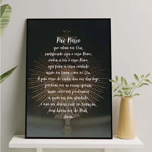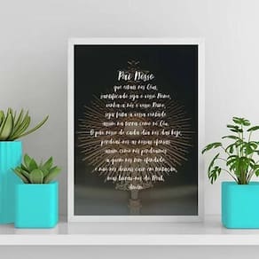 Quadro oração pai nosso - santíssimo 33x24cm - com vidro Moldura: madeira preta Informações do produto tire todas as suas dúvidas no descritivo abaixo: decoração para quarto, sala, cozinha, escritório, área gourmet e muito mais. Chega de paredes vazias medidas - cada peça tem 33x24cm a4 . Material do papel - papel fotográfico brilhante de altíssima resolução acabamento - todos os quadros são acompanhados de vidro para proteção da imagem. - moldura em madeira maciça na cor preta ou branca conforme produto escolhido e pendurador . - os quadros são embalados de forma segura com plástico bolha com camada dupla de acordo com o tamanho dos quadros. Garantia - garantia de 3 meses. Meu quadro chegou. Como posso fixá-lo Você precisa apenas de um martelo e um prego, pois os quadros já vão acompanhados de penduradores. Esta é a forma mais indicada. Como posso limpar meu quadro A limpeza é feita como um móvel comum da sua casa. Apenas um pano seco ou espanador são suficientes para tal Ean: 7897270254829