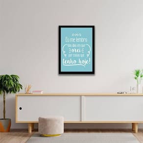 Quadro orei por coisas que tenho hoje, azul 24x18cm Moldura: madeira preta Informações do produto tire todas as suas dúvidas no descritivo abaixo: decoração para quarto, sala, cozinha, escritório, área gourmet e muito mais. Chega de paredes vazias medidas - cada peça tem 24x18cm a5 . Material do papel - papel fotográfico brilhante de altíssima resolução acabamento - todos os quadros são acompanhados de uma película de acetato para proteção da imagem. - moldura em madeira maciça na cor branca e pendurador móvel que pode ser retirado facilmente caso deseje fixar com fita dupla face. - os quadros são embalados de forma segura com plástico bolha com camada dupla de acordo com o tamanho dos quadros. - de 3 meses prazo de envio pedimos 24 horas úteis no máximo para enviar seu pedido após o envio, segue os prazos normais dos correios, cerca de 7 dias úteis exceto para norte e nordeste, que pode ser de até 14 dias úteis. Em diversas cidades, este prazo normalmente é reduzido, mas depende do prazo dos correios. Meu quadro chegou. Como posso fixá-lo Você precisa apenas de um martelo e um prego, pois os quadros já vão acompanhados de penduradores. Esta é a forma mais indicada. Caso prefira, você pode utilizar uma fita dupla face neste caso, sugerimos de alta qualidade para evitar que descole e seu quadro caia . Como posso limpar meu quadro A limpeza é feita como um móvel comum da sua casa. Apenas um pano seco ou espanador são suficientes para tal Ean: 7892091051923
