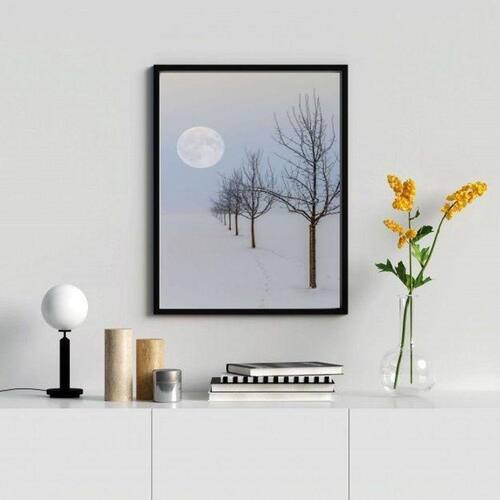 O Quadro Paisagem Neve Árvores Lua é perfeito para decorar seu quarto, sala, cozinha, escritório, área gourmet e muito mais. Chega de paredes vazias! Com medidas de 45x34cm A3 , este quadro possui um lindo design de paisagem de neve com árvores e lua, trazendo uma atmosfera tranquila e aconchegante para o ambiente.