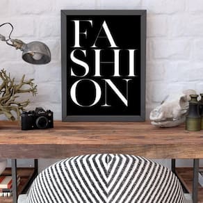 Quadro palavra fashion fundo preto 33x24cm - com vidro Moldura: madeira preta Informações do produto Decoração para quarto, sala, cozinha, escritório, área gourmet e muito mais. Chega de paredes vazias medidas - cada peça tem 33x24cm a4 . Material do papel - papel fotográfico brilhante de altíssima resolução Acabamento - todos os quadros são acompanhados de vidro para proteção da imagem. - Moldura em madeira maciça na cor preta e pendurador . - Os quadros são embalados de forma segura com plástico bolha com camada dupla de acordo com o tamanho dos quadros. - de 3 meses. Meu quadro chegou. Como posso fixá-lo Você precisa apenas de um martelo e um prego, pois os quadros já vão acompanhados de penduradores. Esta é a forma mais indicada. Como posso limpar meu quadro A limpeza é feita como um móvel comum da sua casa. Apenas um pano seco ou espanador são suficientes para tal Ean: 7895142209007