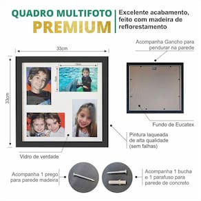 DescriçãoSe você procura uma solução para pendurar ou colocar suasmelhores fotos num quadro multifoto na parede os quadros da clip são a melhor maneira de fazer isso. Resistente, lindo, desenvolvidos com madeira de reflorestamento, possuem ganchos, pregos e buchas para facilitar sua vida na hora de emoldurar suas fotos na parede.Assim vocênão precisa sair de casa e mantémsuas recordações intactas para sempre.Perfeito para aqueles que necessitam guardar os melhores momentos vividos por perto. Destaca-se por seu design jovial e por suas lindas cores vibrantes Beneficio ao dia a dia, tanto em seu ambiente de trabalho ou em casa. Grandes aliados para reinventar a decoração, os quadros são uma opção prática para dar sua própria identidade ao seu ambiente.Cores disponíveisPreto-noire, branco-neveEspecificações:Madeira de reflorestamento livre de imperfeições com acabamento laqueado.Qualidade premium feito com maquinário de última geraçãoAcompanha: vidro de 2mm liso incolorAcompanha: 1 pregos (parede de madeira) 1 buchas 1 parafusos ( parede de concreto)Medidas aproximadas: 1 x 33 x 33 (profundidade x altura x largura)Para 4 fotos 10x15Pode ser utilizado na vertical ou horizontal.Garantia: 3 mêses contra defeitos de fabricação.Despacho em 24 horasEnviamos para todo brasilDireto da fabrica25 anos de experiênciaEmbalagen seguraQualidade comprovadaGarantia de trocaTem alguma dúvdia. Faça-nos uma perguntaLimpeza e cuidados: limpar estrutura com pano levemente umedecido com água, seguido de pano seco. Cuidados: não utilizar produtos químicos ou abrasivos na limpeza. Evitar batidas.Para isso basta navegar por nossos anúncios em mais anúncios do vendedor ou em ver todos os anncios e adicionar ao carrinho os produtos desejados um de cada vez.História clipO suíço, alexander buholzer decidiu quando mais jovem, vir a america do sul. O clima e a recepção dos brasileiros fizeram com que o brasil se destacasse entre os outros países, e , portanto em 1994, escolheu ficar e montar sua empresa nesta linda terra tropical.Alex desde pequeno tinha um grande interesse em guardar todos os retratos da sua família, principalmente, porquê sem estas fotos não existiriam histórias . Assim nasceu a empresa clip juntos com ela todos os seus álbuns, porta retratos e produtos para guardar suas melhores lembranças de vida................