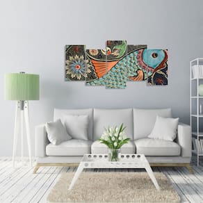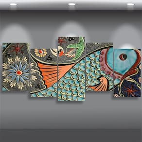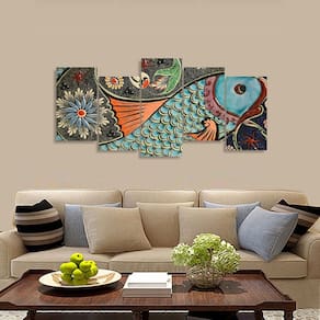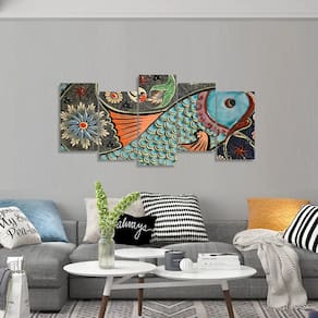 Dimensões do Produto: Quadro decorativo Mosaico de 5 Peças: Tamanho total de 125x60 cm Comprimento x Altura 04 Peças laterais de 25x45 cm cada 01 Peça Central de 25x60 cm. Espaçamento sugerido entre as peças 1 cm Espessura do produto 9 mm