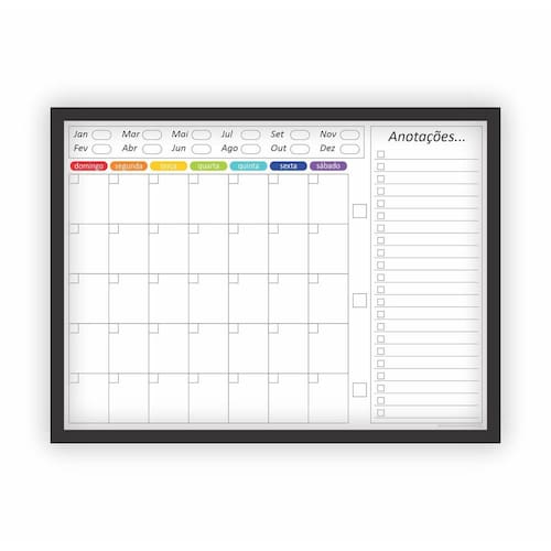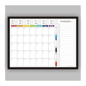 Quadro Planejamento Mensal Planner Com Moldura Mod02Os Nossos Quadros de Parede são impressos com tinta Eco-Solventes com qualidade fotográfica em Vinil Autocolante e depois fixado em uma chapa de MDF com 3mm de espessura, seguem juntamente fitas dupla face para fixação. São ideais para quem quer fazer mudanças em qualquer ambiente de sua casa sem gastar muito, além do seu preço acessível dispensa a contratação de profissionais, já que você mesmo a pode fazer a instalação.Quadro de Planejamento com Moldura + 3 canetas azul, preta e vermelha com suporte.Medida 67 cm x 50 cm.Ideal para:- Anotações;- Plano de Estudos;- Negócios;- Dieta;- Metas;- Compromissos;- Escalas.Pronto para fixar e escrever.Recomendamos limpeza periódica com removedor.Acompanha fita dupla face de alta performance