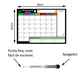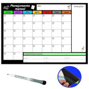 Quadro Planejamento Tarefas Mensal Magnético Imã Geladeira Este quadro magnético para o planejamento de compromissos mensais é uma ferramenta prática e eficaz para manter o controle das atividades e compromissos ao longo do mês. Esse quadro é especialmente útil quando colocado na geladeira, um local de fácil acesso e visibilidade na maioria das casas. Ele ajuda a organizar os compromissos, eventos e tarefas importantes de maneira visual e intuitiva. A parte de trás é totalmente coberta por manta de imã super aderente. Juntamente, é enviada uma caneta preta de ponta fina e com borracha tipo espuma na ponta. Ela também possui um imã em seu corpo, o que permite sua fixação na geladeira. Caso a tinta acabe, esta caneta pode ser facilmente encontrada em qualquer papelaria.