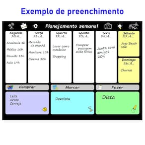 - Superfície lisa e fácil de apagar - Reutilizável infinitas vezes - Divisões para cada dia da semana e seções extras “Comprar”, “Marcar” e “Fazer” - Visual moderno e didático - Ideal para uso doméstico, escritório ou estudos