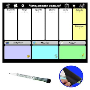 Quadro Planejamento Tarefas Semanal Magnético Imã Geladeira Este quadro magnético para o planejamento de compromissos semanais é uma ferramenta prática e eficaz para manter o controle das atividades e compromissos ao longo da semana. Esse quadro é especialmente útil quando colocado na geladeira, um local de fácil acesso e visibilidade na maioria das casas. Ele ajuda a organizar os compromissos, eventos e tarefas importantes de maneira visual e intuitiva. A parte de trás é totalmente coberta por manta de imã super aderente. Juntamente, é enviada uma caneta preta de ponta fina e com borracha tipo espuma na ponta. Ela também possui um imã em seu corpo, o que permite sua fixação na geladeira. Caso a tinta acabe, esta caneta pode ser facilmente encontrada em qualquer papelaria.