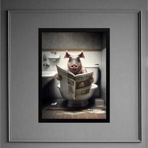Quadro porco no banheiro lendo jornal 24x18cm Moldura: madeira preta Informações do produto tire todas as suas dúvidas no descritivo abaixo: decoração para quarto, sala, cozinha, escritório, área gourmet e muito mais. Chega de paredes vazias medidas - cada peça tem 24x18cm a5 . Material do papel - papel fotográfico brilhante de altíssima resolução acabamento - todos os quadros são acompanhados de uma película de acetato para proteção da imagem. - os quadros são embalados de forma segura com plástico bolha com camada dupla de acordo com o tamanho dos quadros. Garantia - garantia de 3 meses. Meu quadro chegou. Como posso fixá-lo Você precisa apenas de um martelo e um prego, pois os quadros já vão acompanhados de penduradores. Esta é a forma mais indicada. Caso prefira, você pode utilizar uma fita dupla face neste caso, sugerimos de alta qualidade para evitar que descole e seu quadro caia . Como posso limpar meu quadro A limpeza é feita como um móvel comum da sua casa. Apenas um pano seco ou espanador são suficientes para tal