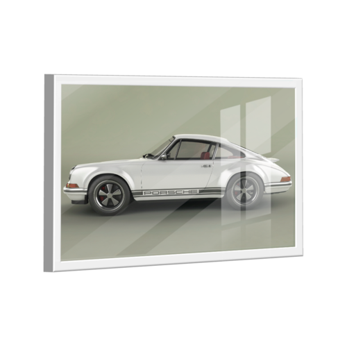 Quadro Porsche 911 Branco Metálico Lado -- BR ARTES Moldura Branca e Vidro - Médio 84x54 -