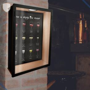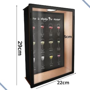 Dimensões: Comprimento: 28 cm; Largura: 21 cm; Profundidade:5 cm; Texto ao fundo: wine is always the answer vinho é sempre a resposta ; Imagem: tipos de vinhos; Película transparente em pet, não trinca ou amarela como o acrílico; Produto entregue já montado; Corte à laser - extrema qualidade e acabamento; Fabricado com 100% madeira de reflorestamento; Fixação por parafuso ou fita dupla face estes ítens não acompanham o produto ; Estampa impressa em adesivo de alta resistência; Design moderdo e elegante;