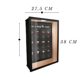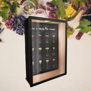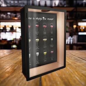 Dimensões: Comprimento: 38 cm; Largura: 27,5 cm; Profundidade: 6 cm; Texto ao fundo: wine is always the answer vinho é sempre a resposta ; Imagem: tipos de vinhos; Película transparente em pet, não trinca ou amarela como o acrílico; Produto entregue já montado; Corte à laser - extrema qualidade e acabamento; Fabricado com 100% madeira de reflorestamento; Fixação por parafuso ou fita dupla face estes ítens não acompanham o produto ; Estampa impressa em adesivo de alta resistência; Design moderdo e elegante;