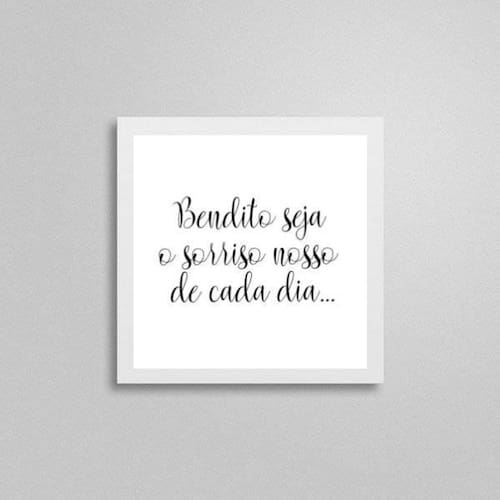 Quadro quadrado bendito seja o sorriso 20x20cm Moldura: madeira branca Informações do produto tire todas as suas dúvidas no descritivo abaixo: decoração para quarto, sala, cozinha, escritório, área gourmet e muito mais. Chega de paredes vazias medidas - cada peça tem 20x20cm. Material do papel - papel fotográfico brilhante de altíssima resolução acabamento - todos os quadros são acompanhados de uma película de acetato para proteção da imagem. - os quadros são embalados de forma segura com plástico bolha com camada dupla de acordo com o tamanho dos quadros. - de 3 meses. Meu quadro chegou. Como posso fixá-lo Você precisa apenas de um martelo e um prego, pois os quadros já vão acompanhados de penduradores. Esta é a forma mais indicada. Caso prefira, você pode utilizar uma fita dupla face neste caso, sugerimos de alta qualidade para evitar que descole e seu quadro caia . Como posso limpar meu quadro A limpeza é feita como um móvel comum da sua casa. Apenas um pano seco ou espanador são suficientes para tal