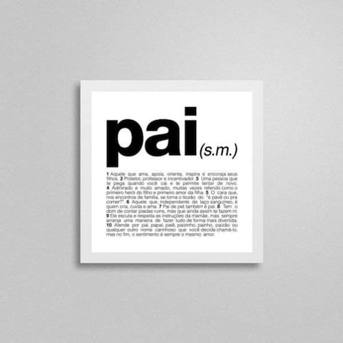 Quadro quadrado definição de pai 20x20cm Moldura: madeira branca Informações do produto tire todas as suas dúvidas no descritivo abaixo: decoração para quarto, sala, cozinha, escritório, área gourmet e muito mais. Chega de paredes vazias medidas - cada peça tem 20x20cm. Material do papel - papel fotográfico brilhante de altíssima resolução acabamento - todos os quadros são acompanhados de uma película de acetato para proteção da imagem. - os quadros são embalados de forma segura com plástico bolha com camada dupla de acordo com o tamanho dos quadros. - de 3 meses. Meu quadro chegou. Como posso fixá-lo Você precisa apenas de um martelo e um prego, pois os quadros já vão acompanhados de penduradores. Esta é a forma mais indicada. Caso prefira, você pode utilizar uma fita dupla face neste caso, sugerimos de alta qualidade para evitar que descole e seu quadro caia . Como posso limpar meu quadro A limpeza é feita como um móvel comum da sua casa. Apenas um pano seco ou espanador são suficientes para tal