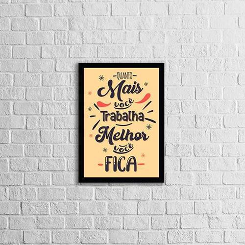 Quadro Quanto Mais Você Trabalha, Melhor Você Fica 24X18Cm Moldura: madeira branca Informações do produto Decoração para quarto, sala, cozinha, escritório, área gourmet e muito mais. Chega de paredes vazias. Medidas - cada peça tem 24x18cm a5 . Material do papel - papel fotográfico brilhante de altíssima resolução Acabamento - todos os quadros são acompanhados de uma película de acetato para proteção da imagem. - moldura em madeira maciça na cor branca e pendurador móvel que pode ser retirado facilmente caso deseje fixar com fita dupla face. - os quadros são embalados de forma segura com plástico bolha com camada dupla de acordo com o tamanho dos quadros. - de 3 meses Meu quadro chegou. Como posso fixá-lo: Você precisa apenas de um martelo e um prego, pois os quadros já vão acompanhados de penduradores. Esta é a forma mais indicada. Caso prefira, você pode utilizar uma fita dupla face neste caso, sugerimos de alta qualidade para evitar que descole e seu quadro caia . Como posso limpar meu quadro: A limpeza é feita como um móvel comum da sua casa. Apenas um pano seco ou espanador são suficientes para tal Marca: Não Informado