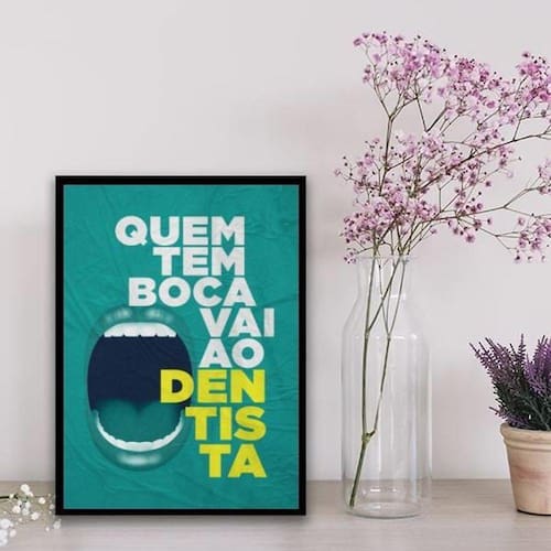 Quadro quem tem boca vai ao dentista 33x24cm - com vidro Moldura: madeira preta Informações do produtoDecoração para quarto, sala, cozinha, escritório, área gourmet e muito mais. Chega de paredes vazias Medidas - cada peça tem 33x24cm a4 . Material do papel - papel fotográfico brilhante de altíssima resolução Acabamento - todos os quadros são acompanhados de vidro para proteção da imagem. - moldura em madeira maciça e pendurador. - os quadros são embalados de forma segura com plástico bolha com camada dupla de acordo com o tamanho dos quadros. Garantia - garantia de 3 meses. Meu quadro chegou. Como posso fixá-loVocê precisa apenas de um martelo e um prego, pois os quadros já vão acompanhados de penduradores. Esta é a forma mais indicada. Como posso limpar meu quadroA limpeza é feita como um móvel comum da sua casa. Apenas um pano seco ou espanador são suficientes para tal