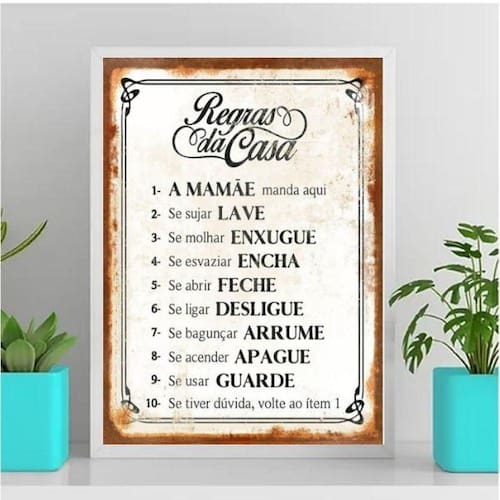Quadro regras da casa 45x34cm - com vidro Moldura: madeira preta Informações do produtoDecoração para quarto, sala, cozinha, escritório, área gourmet e muito mais.Chega de paredes vazias Medidas - cada peça tem 45x34cm a3 .Material do papel - papel fotográfico brilhante de altíssima resolução Acabamento - todos os quadros são acompanhados de vidro para proteção da imagem.- moldura em madeira maciça e pendurador. - os quadros são embalados de forma segura com plástico bolha com camada dupla de acordo com o tamanho dos quadros. Garantia - garantia de 3 meses. Meu quadro chegou. Como posso fixá-lo Você precisa apenas de um martelo e um prego, pois os quadros já vão acompanhados de penduradores. Esta é a forma mais indicada. Caso prefira, você pode utilizar uma fita dupla face neste caso, sugerimos de alta qualidade para evitar que descole e seu quadro caia . Como posso limpar meu quadro A limpeza é feita como um móvel comum da sua casa. Apenas um pano seco ou espanador são suficientes para tal