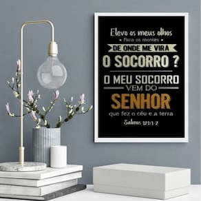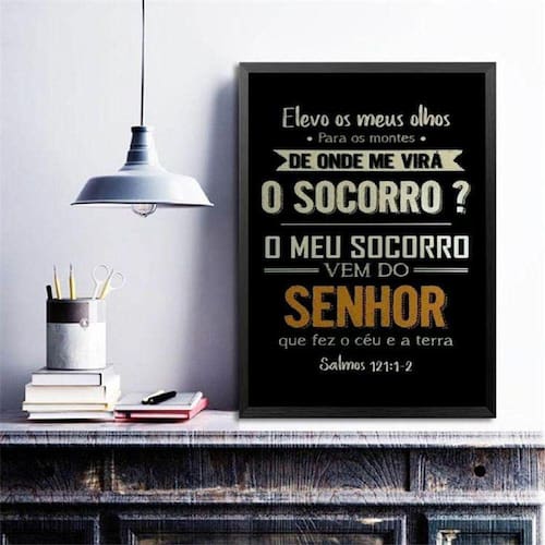 Quadro salmo 121- o socorro vem do senhor 45x34cm Moldura: madeira branca Informações do produto tire todas as suas dúvidas no descritivo abaixo: decoração para quarto, sala, cozinha, escritório, área gourmet e muito mais. Chega de paredes vazias. Medidas - cada peça tem 45x34cm a3 . Material do papel - papel fotográfico brilhante de altíssima resolução acabamento - todos os quadros são acompanhados de uma película de acetato para proteção da imagem. - os quadros são embalados de forma segura com plástico bolha com camada dupla de acordo com o tamanho dos quadros. Garantia - garantia de 3 meses. Meu quadro chegou. Como posso fixá-lo Você precisa apenas de um martelo e um prego, pois os quadros já vão acompanhados de penduradores. Esta é a forma mais indicada. Caso prefira, você pode utilizar uma fita dupla face neste caso, sugerimos de alta qualidade para evitar que descole e seu quadro caia . Como posso limpar meu quadro A limpeza é feita como um móvel comum da sua casa. Apenas um pano seco ou espanador são suficientes para tal Ean: 7891881951856
