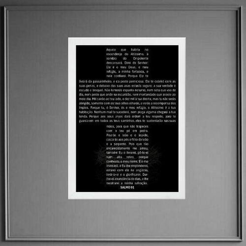 Quadro salmo 91 - cruz 33x24cm Moldura: madeira branca Informações do produto tire todas as suas dúvidas no descritivo abaixo: decoração para quarto, sala, cozinha, escritório, área gourmet e muito mais. Chega de paredes vazias medidas - cada peça tem 33x24cm a4 . Material do papel - papel fotográfico brilhante de altíssima resolução acabamento - todos os quadros são acompanhados de uma película de acetato para proteção da imagem. - os quadros são embalados de forma segura com plástico bolha com camada dupla de acordo com o tamanho dos quadros. Garantia - garantia de 3 meses. Meu quadro chegou. Como posso fixá-lo Você precisa apenas de um martelo e um prego, pois os quadros já vão acompanhados de penduradores. Esta é a forma mais indicada. Caso prefira, você pode utilizar uma fita dupla face neste caso, sugerimos de alta qualidade para evitar que descole e seu quadro caia . Como posso limpar meu quadro A limpeza é feita como um móvel comum da sua casa. Apenas um pano seco ou espanador são suficientes para tal