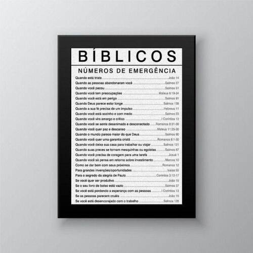 Quadro salmos bíblicos números de emergência 33x24cm Moldura: madeira preta Informações do produto tire todas as suas dúvidas no descritivo abaixo: decoração para quarto, sala, cozinha, escritório, área gourmet e muito mais. Chega de paredes vazias medidas - cada peça tem 33x24cm a4 . Material do papel - papel fotográfico brilhante de altíssima resolução acabamento - todos os quadros são acompanhados de uma película de acetato para proteção da imagem. - os quadros são embalados de forma segura com plástico bolha com camada dupla de acordo com o tamanho dos quadros. Garantia - garantia de 3 meses. Meu quadro chegou. Como posso fixá-lo Você precisa apenas de um martelo e um prego, pois os quadros já vão acompanhados de penduradores. Esta é a forma mais indicada. Caso prefira, você pode utilizar uma fita dupla face neste caso, sugerimos de alta qualidade para evitar que descole e seu quadro caia . Como posso limpar meu quadro A limpeza é feita como um móvel comum da sua casa. Apenas um pano seco ou espanador são suficientes para tal Ean: 7893031826748
