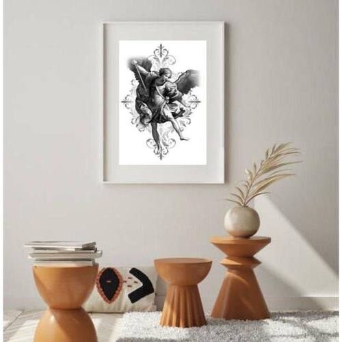 Quadro são miguel arcanjo preto e branco - 60x48cm Moldura: madeira branca Informações do produto tire todas as suas dúvidas no descritivo abaixo: decoração para quarto, sala, cozinha, escritório, área gourmet e muito mais. Chega de paredes vazias medidas - cada peça tem 60x48cm . Material do papel - papel fotográfico brilhante de altíssima resolução acabamento - todos os quadros são acompanhados de vidro para proteção da imagem. - moldura em madeira maciça na cor preta ou branca conforme produto escolhido e pendurador. - paspatur branco com 7cm de largura - os quadros são embalados de forma segura com plástico bolha com camada dupla de acordo com o tamanho dos quadros. Garantia - garantia de 3 meses. Meu quadro chegou. Como posso fixá-lo Você precisa apenas de um martelo e um prego, pois os quadros já vão acompanhados de penduradores. Esta é a forma mais indicada. Como posso limpar meu quadro A limpeza é feita como um móvel comum da sua casa. Apenas um pano seco ou espanador são suficientes para tal
