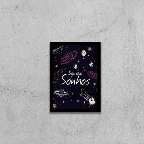 Quadro siga seus sonhos 45x34cm - com vidro Moldura: madeira preta Informações do produto tire todas as suas dúvidas no descritivo abaixo: decoração para quarto, sala, cozinha, escritório, área gourmet e muito mais. Chega de paredes vazias medidas - cada peça tem 45x34cm a3 . Material do papel - papel fotográfico brilhante de altíssima resolução acabamento - todos os quadros são acompanhados de vidro para proteção da imagem. - moldura em madeira maciça na cor preta e pendurador . - os quadros são embalados de forma segura com plástico bolha com camada dupla de acordo com o tamanho dos quadros. Garantia - garantia de 3 meses. Meu quadro chegou. Como posso fixá-lo Você precisa apenas de um martelo e um prego, pois os quadros já vão acompanhados de penduradores. Esta é a forma mais indicada. Como posso limpar meu quadro A limpeza é feita como um móvel comum da sua casa. Apenas um pano seco ou espanador são suficientes para tal