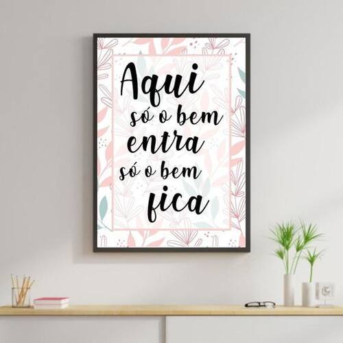 Quadro só o bem entra, só o bem fica flores 33x24cm - com vidro Moldura: madeira preta Informações do produto tire todas as suas dúvidas no descritivo abaixo: decoração para quarto, sala, cozinha, escritório, área gourmet e muito mais. Chega de paredes vazias medidas - cada peça tem 33x24cm a4 . Material do papel - papel fotográfico brilhante de altíssima resolução acabamento - todos os quadros são acompanhados de vidro para proteção da imagem. - moldura em madeira maciça na cor preta e pendurador . - os quadros são embalados de forma segura com plástico bolha com camada dupla de acordo com o tamanho dos quadros. - de 3 meses. Meu quadro chegou. Como posso fixá-lo Você precisa apenas de um martelo e um prego, pois os quadros já vão acompanhados de penduradores. Esta é a forma mais indicada. Como posso limpar meu quadro A limpeza é feita como um móvel comum da sua casa. Apenas um pano seco ou espanador são suficientes para tal Ean: 7895142242189