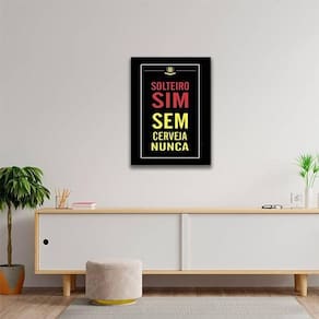 Quadro solteiro sim, sem cerveja nunca 33x24cm - com vidro Moldura: madeira preta Informações do produto tire todas as suas dúvidas no descritivo abaixo: decoração para quarto, sala, cozinha, escritório, área gourmet e muito mais. Chega de paredes vazias medidas - cada peça tem 33x24cm a4 . Material do papel - papel fotográfico brilhante de altíssima resolução acabamento - todos os quadros são acompanhados de vidro para proteção da imagem. - moldura em madeira maciça na cor preta e pendurador . - os quadros são embalados de forma segura com plástico bolha com camada dupla de acordo com o tamanho dos quadros. - de 3 meses. Meu quadro chegou. Como posso fixá-lo Você precisa apenas de um martelo e um prego, pois os quadros já vão acompanhados de penduradores. Esta é a forma mais indicada. Como posso limpar meu quadro A limpeza é feita como um móvel comum da sua casa. Apenas um pano seco ou espanador são suficientes para tal Marca: Não Informado