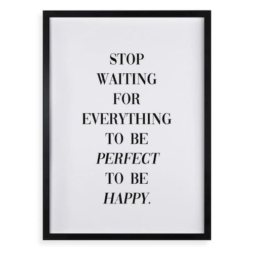 Quadro stop waiting to be happy 24x18cm Cor: moldura preta Informações do produto tire todas as suas dúvidas no descritivo abaixo: decoração para quarto, sala, cozinha, escritório, área gourmet e muito mais. Chega de paredes vazias medidas - cada peça tem 24x18cm a5 . Material do papel - papel fotográfico brilhante de altíssima resolução acabamento - todos os quadros são acompanhados de uma película de acetato para proteção da imagem. - os quadros são embalados de forma segura com plástico bolha com camada dupla de acordo com o tamanho dos quadros. - de 3 meses. Meu quadro chegou. Como posso fixá-lo Você precisa apenas de um martelo e um prego, pois os quadros já vão acompanhados de penduradores. Esta é a forma mais indicada. Caso prefira, você pode utilizar uma fita dupla face neste caso, sugerimos de alta qualidade para evitar que descole e seu quadro caia . Como posso limpar meu quadro A limpeza é feita como um móvel comum da sua casa. Apenas um pano seco ou espanador são suficientes para tal Marca: Não Informado