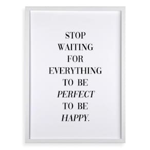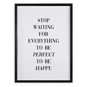Quadro stop waiting to be happy 45x34cm - com vidro Cor: moldura preta Informações do produto tire todas as suas dúvidas no descritivo abaixo: decoração para quarto, sala, cozinha, escritório, área gourmet e muito mais. Chega de paredes vazias medidas - cada peça tem 45x34cm a3 . Material do papel - papel fotográfico brilhante de altíssima resolução acabamento - todos os quadros são acompanhados de vidro para proteção da imagem. - moldura em madeira maciça na cor preta ou branca conforme produto escolhido e pendurador . - os quadros são embalados de forma segura com plástico bolha com camada dupla de acordo com o tamanho dos quadros. - de 3 meses. Meu quadro chegou. Como posso fixá-lo Você precisa apenas de um martelo e um prego, pois os quadros já vão acompanhados de penduradores. Esta é a forma mais indicada. Como posso limpar meu quadro A limpeza é feita como um móvel comum da sua casa. Apenas um pano seco ou espanador são suficientes para tal