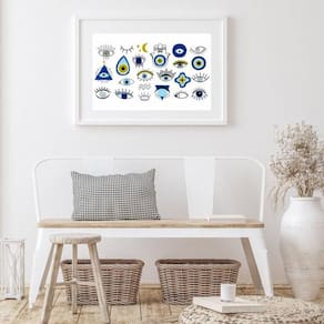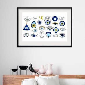 Quadro tipos de olho grego - 60x48cm Moldura: madeira branca Informações do produto tire todas as suas dúvidas no descritivo abaixo: decoração para quarto, sala, cozinha, escritório, área gourmet e muito mais. Chega de paredes vazias medidas - cada peça tem 60x48cm . Material do papel - papel fotográfico brilhante de altíssima resolução acabamento - todos os quadros são acompanhados de vidro para proteção da imagem. - moldura em madeira maciça na cor preta ou branca conforme produto escolhido e pendurador. - paspatur branco com 7cm de largura - os quadros são embalados de forma segura com plástico bolha com camada dupla de acordo com o tamanho dos quadros. Garantia - garantia de 3 meses. Meu quadro chegou. Como posso fixá-lo Você precisa apenas de um martelo e um prego, pois os quadros já vão acompanhados de penduradores. Esta é a forma mais indicada. Como posso limpar meu quadro A limpeza é feita como um móvel comum da sua casa. Apenas um pano seco ou espanador são suficientes para tal