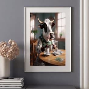 Quadro vaca tomando café - 60x48cm Cor: moldura branca Informações do produto tire todas as suas dúvidas no descritivo abaixo: decoração para quarto, sala, cozinha, escritório, área gourmet e muito mais. Chega de paredes vazias medidas - cada peça tem 60x48cm . Material do papel - papel fotográfico brilhante de altíssima resolução acabamento - todos os quadros são acompanhados de vidro para proteção da imagem. - moldura em madeira maciça na cor preta ou branca conforme produto escolhido e pendurador. - paspatur branco com 7cm de largura - os quadros são embalados de forma segura com plástico bolha com camada dupla de acordo com o tamanho dos quadros. Garantia - garantia de 3 meses. Meu quadro chegou. Como posso fixá-lo Você precisa apenas de um martelo e um prego, pois os quadros já vão acompanhados de penduradores. Esta é a forma mais indicada. Como posso limpar meu quadro A limpeza é feita como um móvel comum da sua casa. Apenas um pano seco ou espanador são suficientes para tal