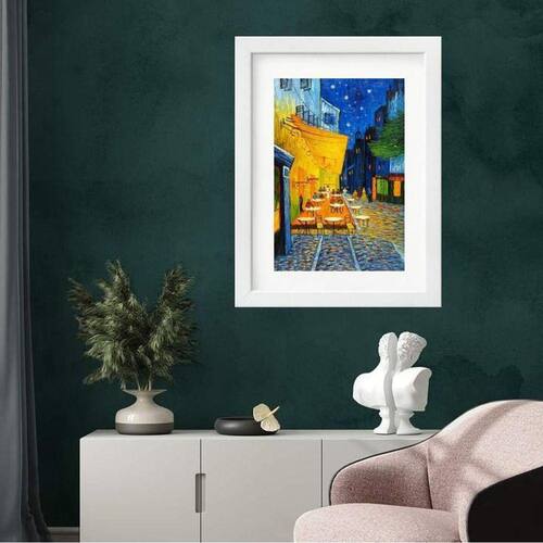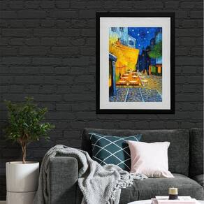 Quadro van gogh terrace at night - 60x48cm Moldura: madeira preta Informações do produto tire todas as suas dúvidas no descritivo abaixo: decoração para quarto, sala, cozinha, escritório, área gourmet e muito mais. Chega de paredes vazias medidas - cada peça tem 60x48cm . Material do papel - papel fotográfico brilhante de altíssima resolução acabamento - todos os quadros são acompanhados de vidro para proteção da imagem. - moldura em madeira maciça na cor preta ou branca conforme produto escolhido e pendurador. - paspatur branco com 7cm de largura - os quadros são embalados de forma segura com plástico bolha com camada dupla de acordo com o tamanho dos quadros. Garantia - garantia de 3 meses. Meu quadro chegou. Como posso fixá-lo Você precisa apenas de um martelo e um prego, pois os quadros já vão acompanhados de penduradores. Esta é a forma mais indicada. Como posso limpar meu quadro A limpeza é feita como um móvel comum da sua casa. Apenas um pano seco ou espanador são suficientes para tal