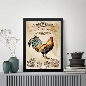 Quadro vintage para cozinha galo 33x24cm - com vidro Cor: moldura preta Informações do produto tire todas as suas dúvidas no descritivo abaixo: decoração para quarto, sala, cozinha, escritório, área gourmet e muito mais. Chega de paredes vazias medidas - cada peça tem 33x24cm a4 . Material do papel - papel fotográfico brilhante de altíssima resolução acabamento - todos os quadros são acompanhados de vidro para proteção da imagem. - moldura em madeira maciça na cor preta ou branca conforme produto escolhido e pendurador . - os quadros são embalados de forma segura com plástico bolha com camada dupla de acordo com o tamanho dos quadros. Garantia - garantia de 3 meses. Meu quadro chegou. Como posso fixá-lo Você precisa apenas de um martelo e um prego, pois os quadros já vão acompanhados de penduradores. Esta é a forma mais indicada. Como posso limpar meu quadro A limpeza é feita como um móvel comum da sua casa. Apenas um pano seco ou espanador são suficientes para tal Ean: 7895351748502