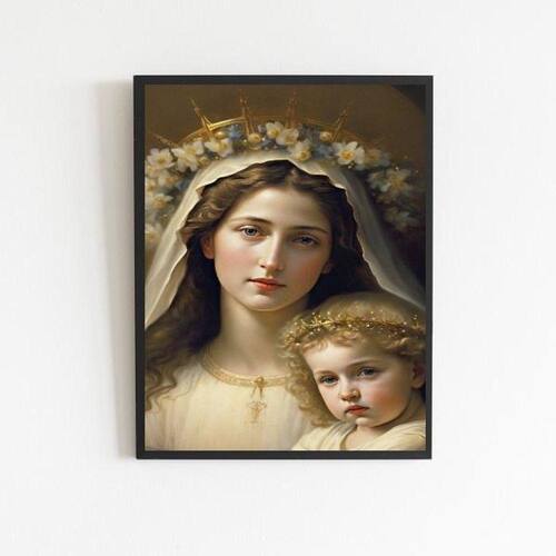 Este quadro da Virgem Maria com o Menino Jesus é perfeito para decorar qualquer ambiente, seja ele um quarto, sala, cozinha, escritório, área gourmet ou qualquer outro espaço que você deseje dar um toque especial. Com medidas de 24x18cm A5 , é uma peça compacta que se adequa facilmente a qualquer parede.